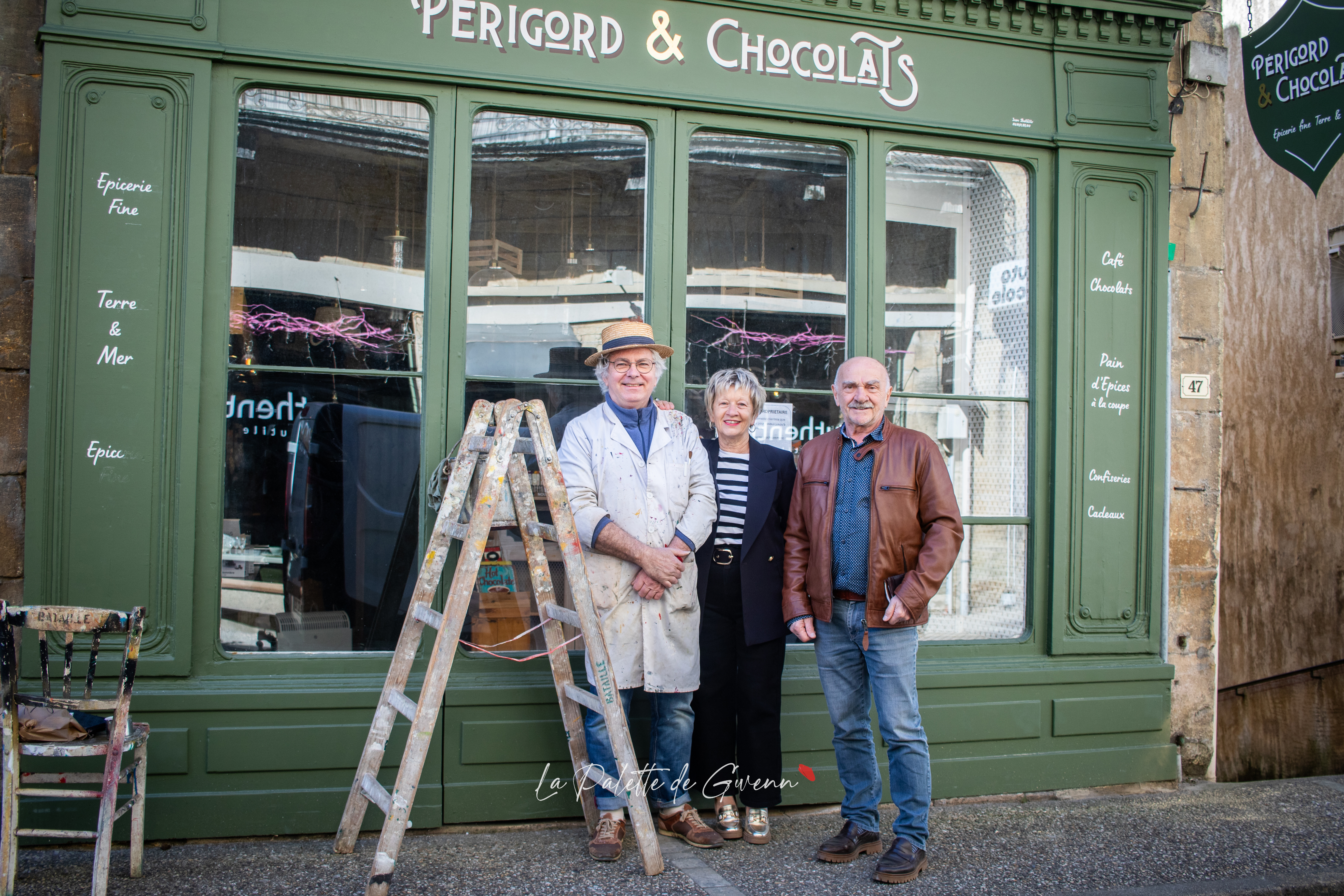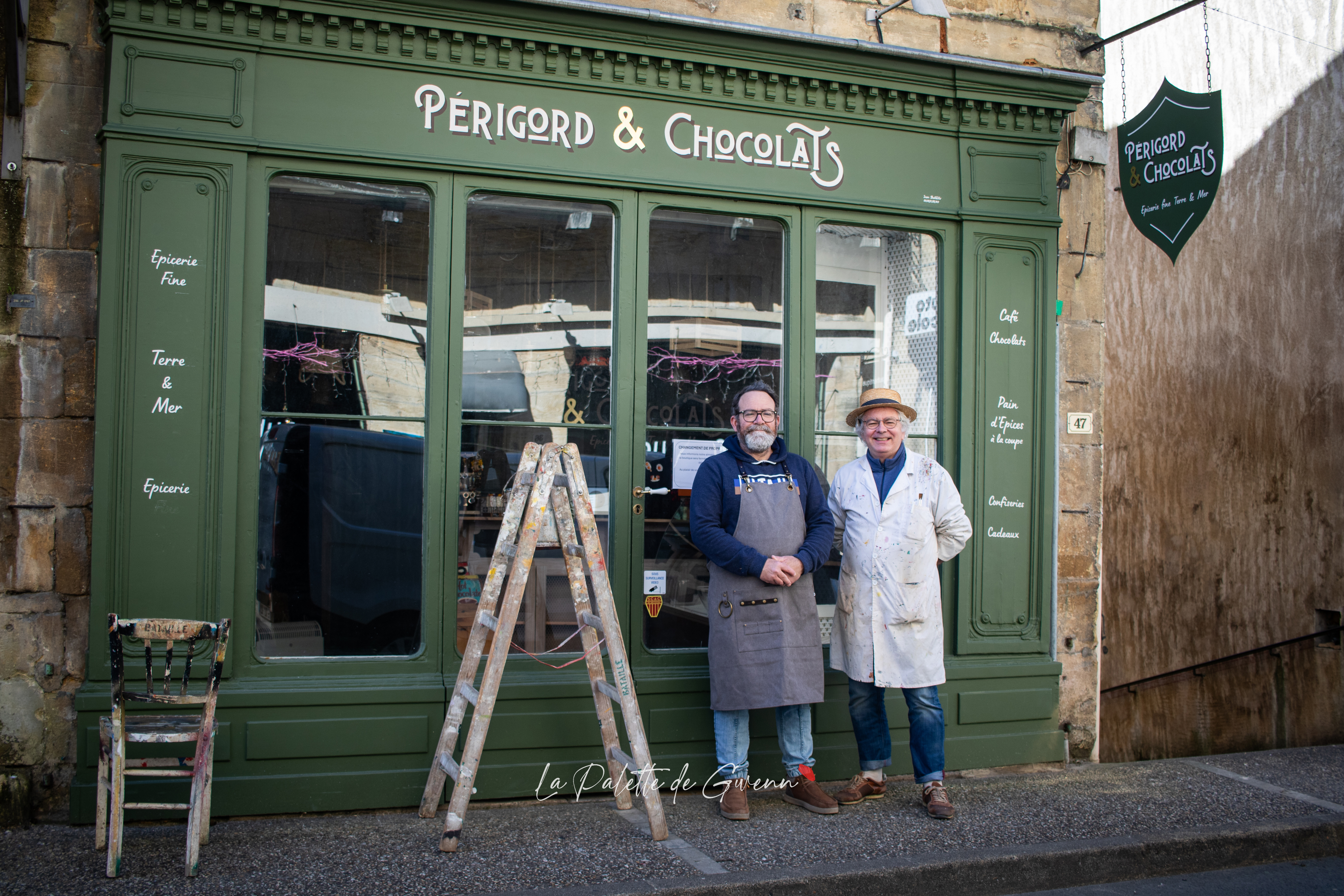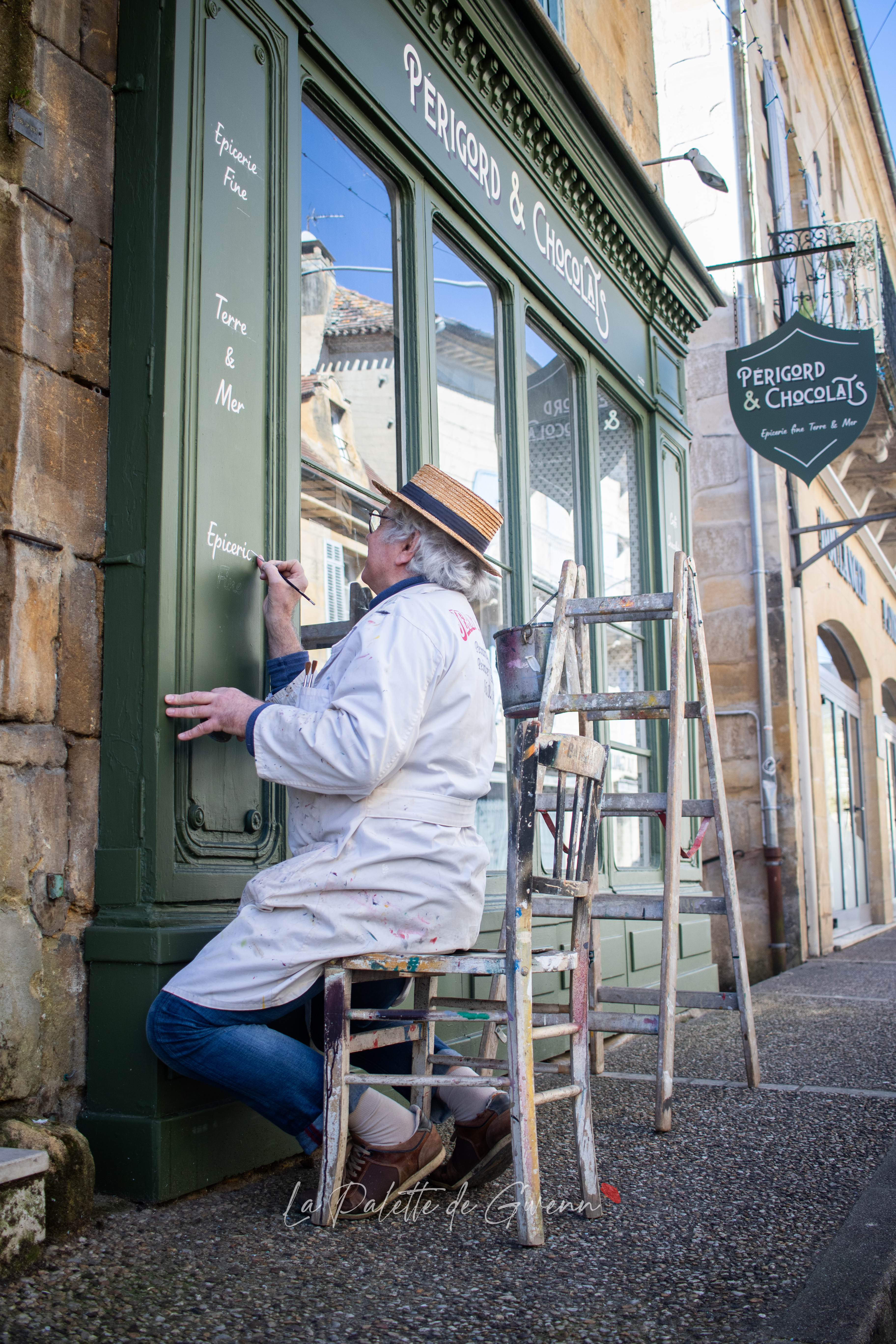 Galerie photo pour la mise en valeur d’un savoir-faire et pour une sauvegarde visuelle d’un patrimoine artisanal de plus de 7 générations de peintre en lettres. Photo-reportage de Jean Bataille, peintre de lettres, sur la devanture de magasin Périgord et Chocolats à Saint-Cyprien !
