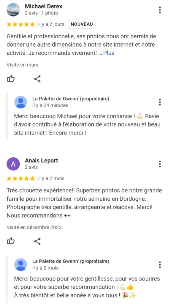 Nous avons passé en avril 2025 un agréable séjour avec nos enfants et nos 5 petits-enfants dans cette belle région du Périgord Noir. Pour un reportage photos, nous avons frappé à la bonne porte en prenant contact avec Gwenn’. Très professionnelle, elle a su capter les émotions, les expressions de de toute la famille. La joie, le bonheur, la gaieté et l’action reflètent sur les prises de vues réalistes. Ce reportage restera en mémoire pour la famille.